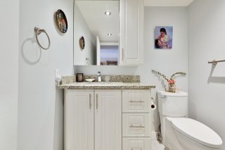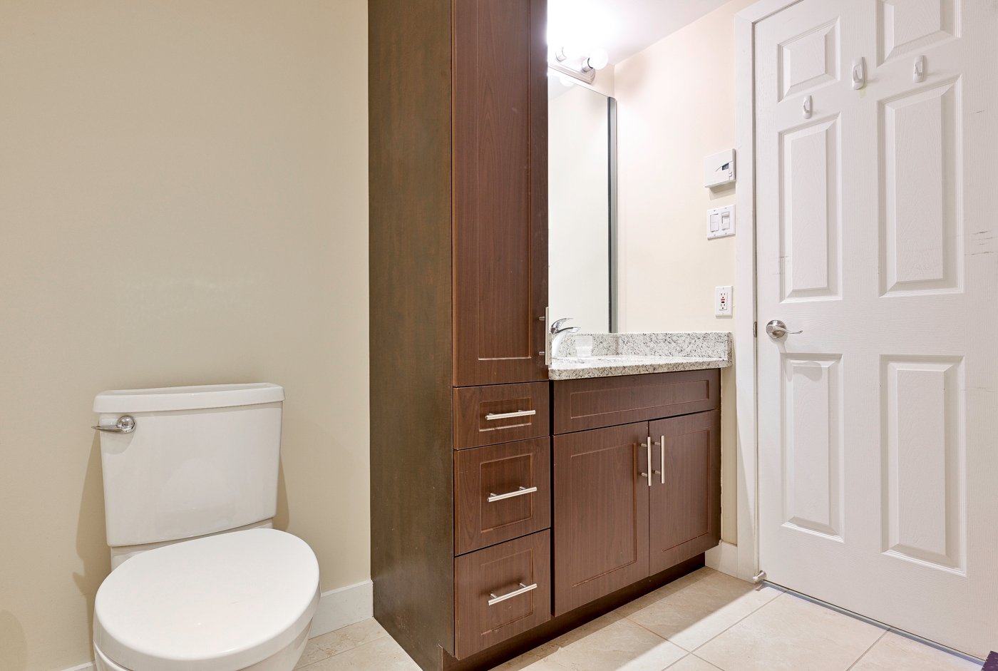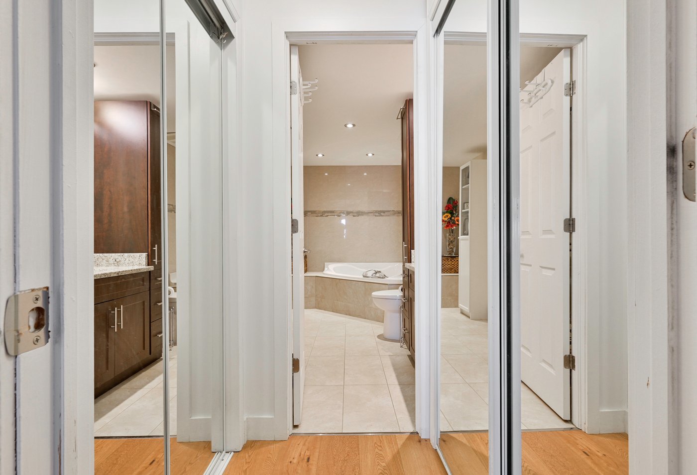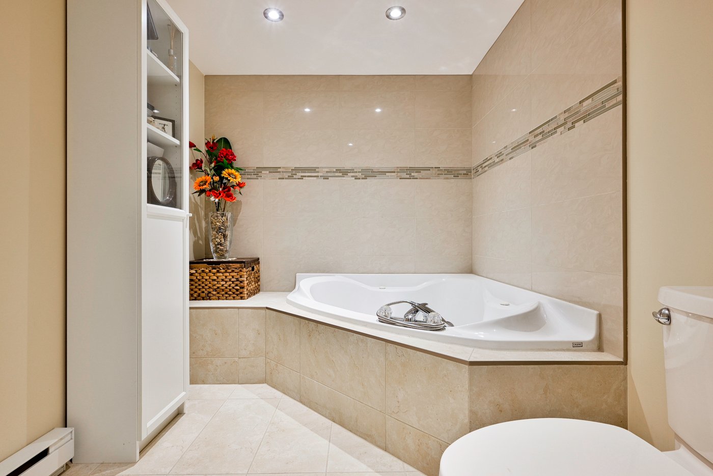 2 grandes chambres avec 2 salles de bains dont une avec douche en céramique, et l'autre avec baignoire à remous et leur comptoir en granite.