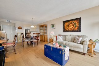 Salle à manger et salon donnant sur un grand balcon couvert vous offrant une vue panoramique et de magnifiques couchers de soleil.